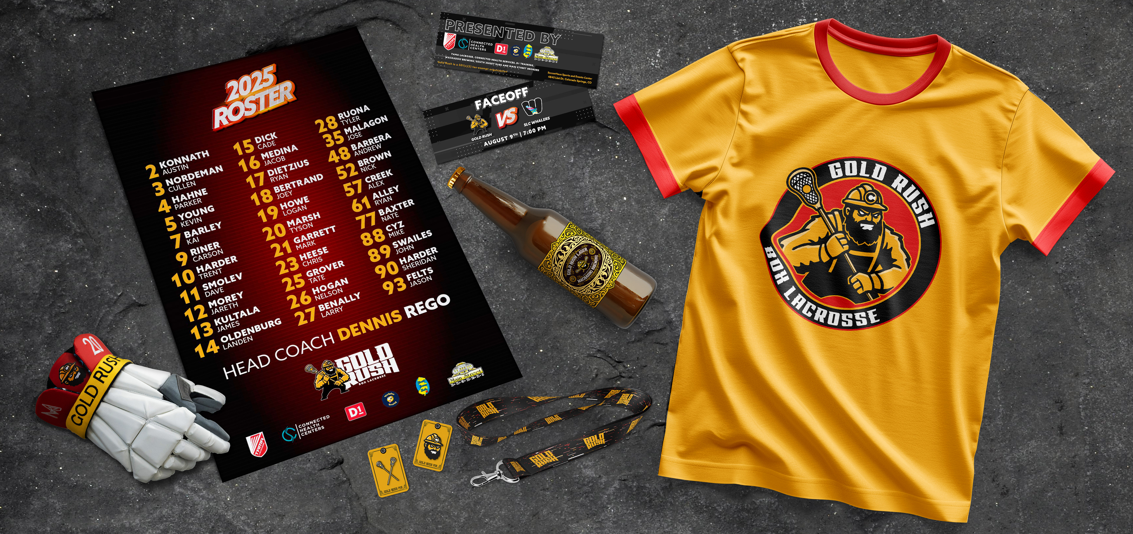 Gold Rush Lacrosse is a nonprofit based in Colorado Springs. They already had a miner logo but needed an updated typography logo and clear branding direction, as they lacked guidance on social media strategy, website setup, and understanding the importance of cohesive branding. I set up their Google account and social media, creating Canva templates that other designers could easily edit for game-day posts, scores, and updates. I also designed assets in multiple formats for print, web, and mobile, including ticket designs for home games and merchandise.