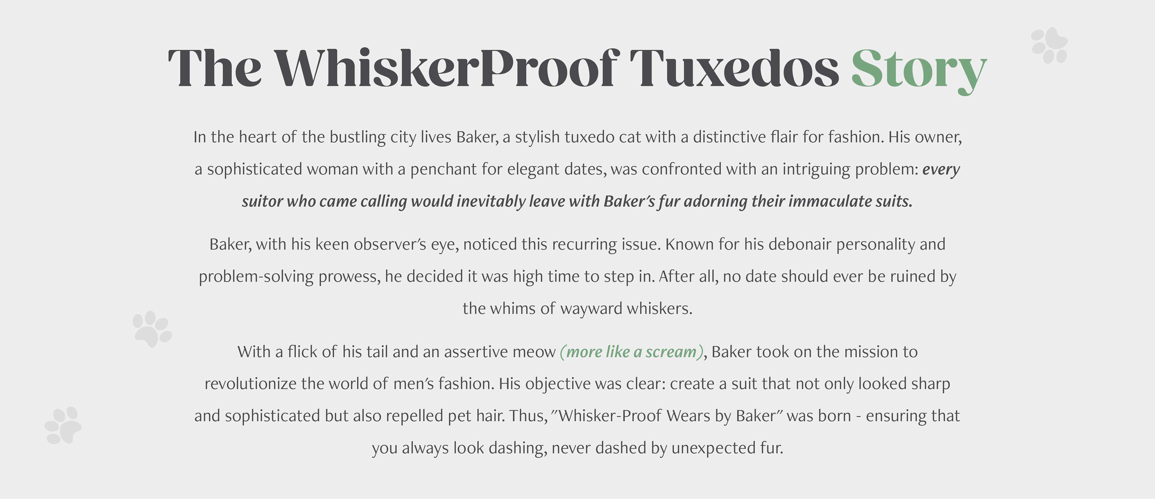 WhiskerProof Tuxedos is a personal project I created to challenge myself in developing branding, copy writing, brand identity, and voice, while designing a build-a-suit website with personality and style.